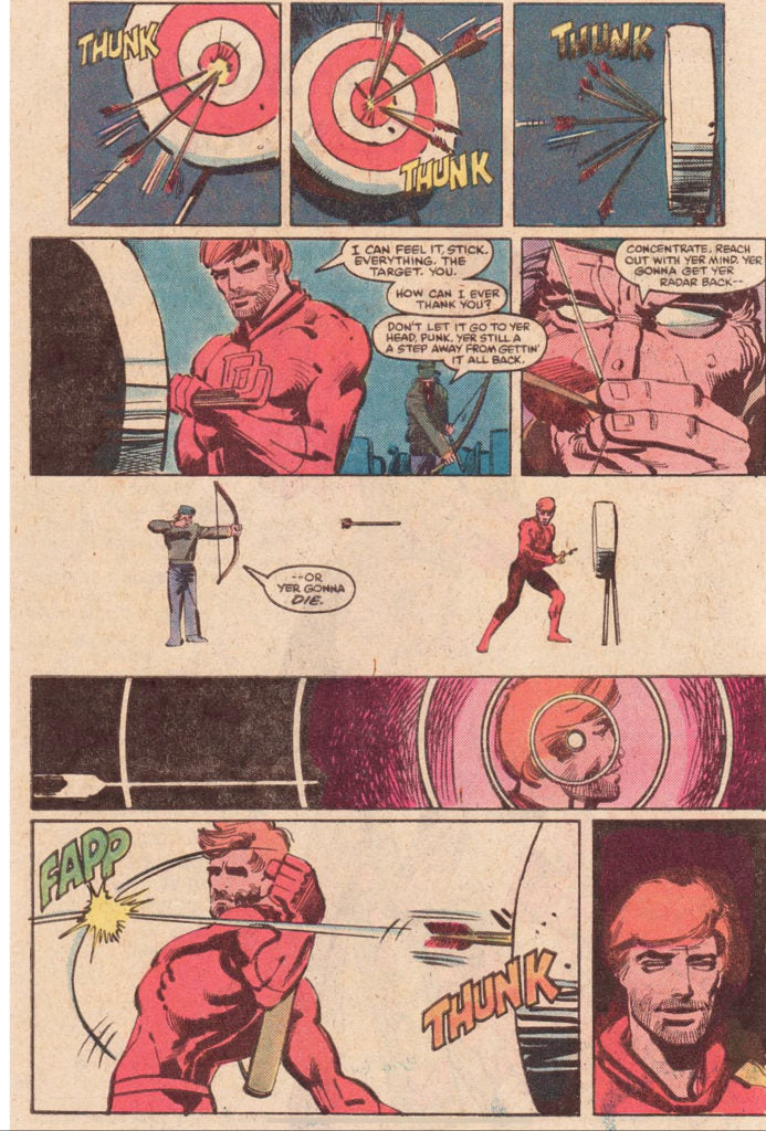 "Where Angels Fear to Tread", script by Frank Miller, pencils by Frank Miller, inks by Klaus Janson; Stick helps his old pupil face his demons and regain his radar sense; The Bugle publishes an expose on Kingpin's candidate for Mayor of New York. Elektra is brought to Kingpin's attention.