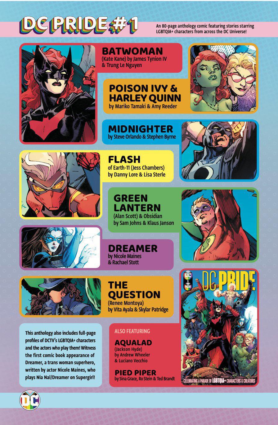 DC celebrates Pride with this incredible collection starring fan-favorite LGBTQIA+ characters Harley Quinn, Poison Ivy, Midnighter, Extraño, Batwoman, Aqualad, Alan Scott, Obsidian, Future State Flash, Renee Montoya, Pied Piper, and many more!