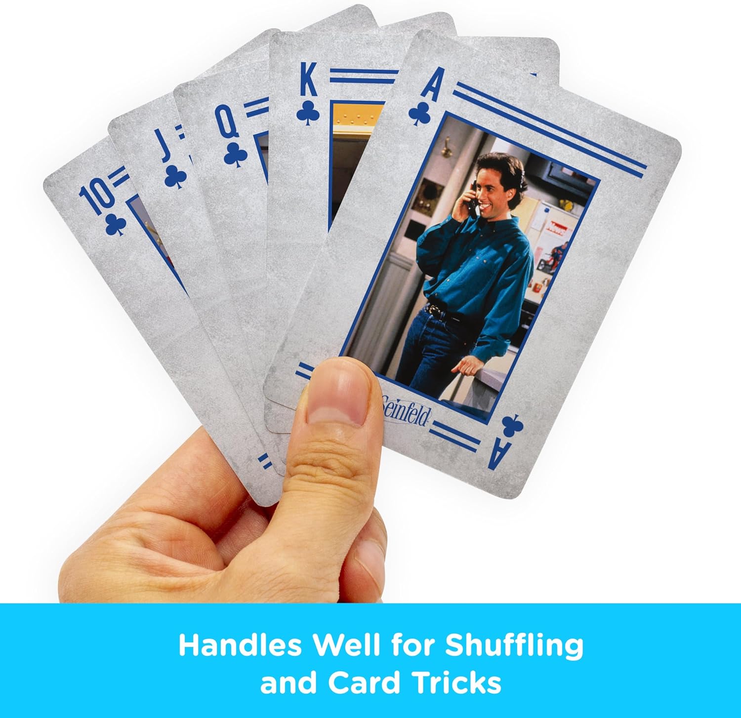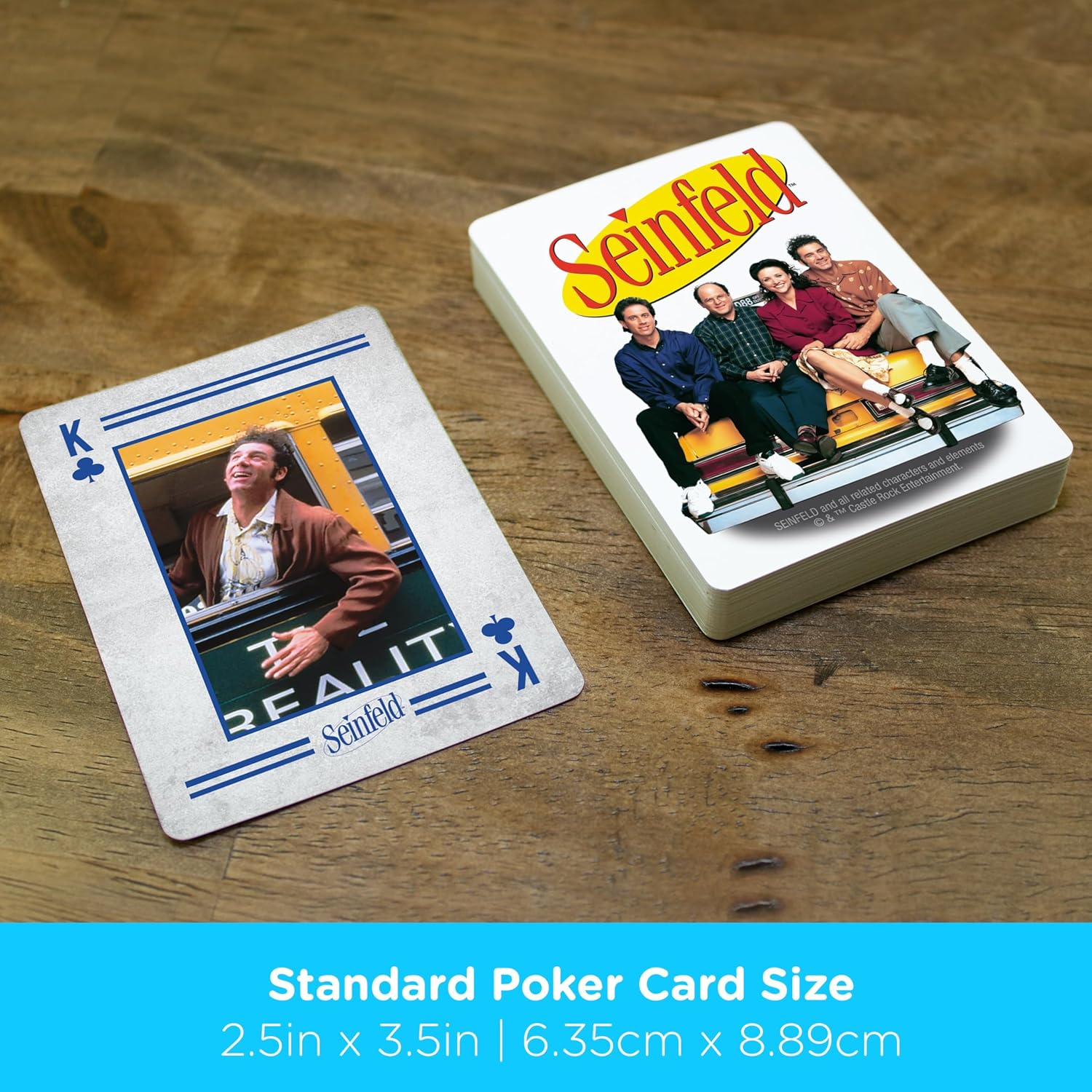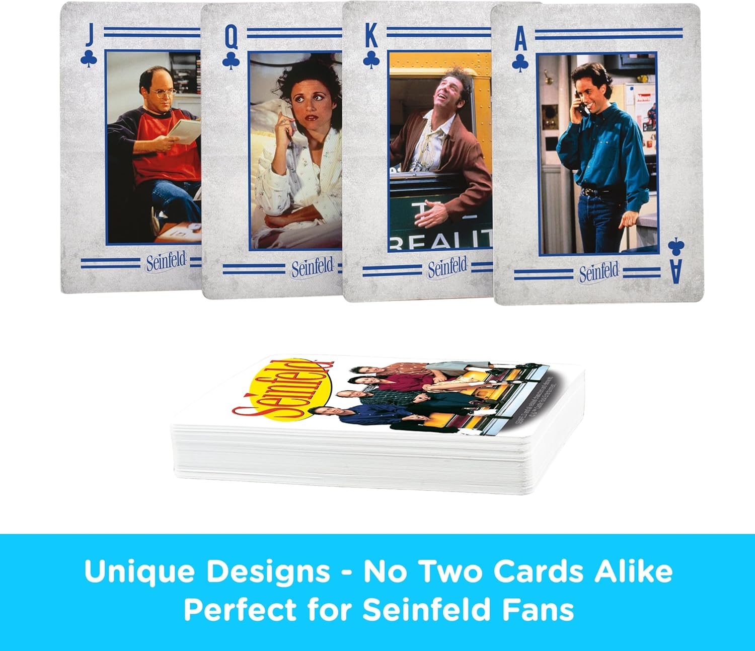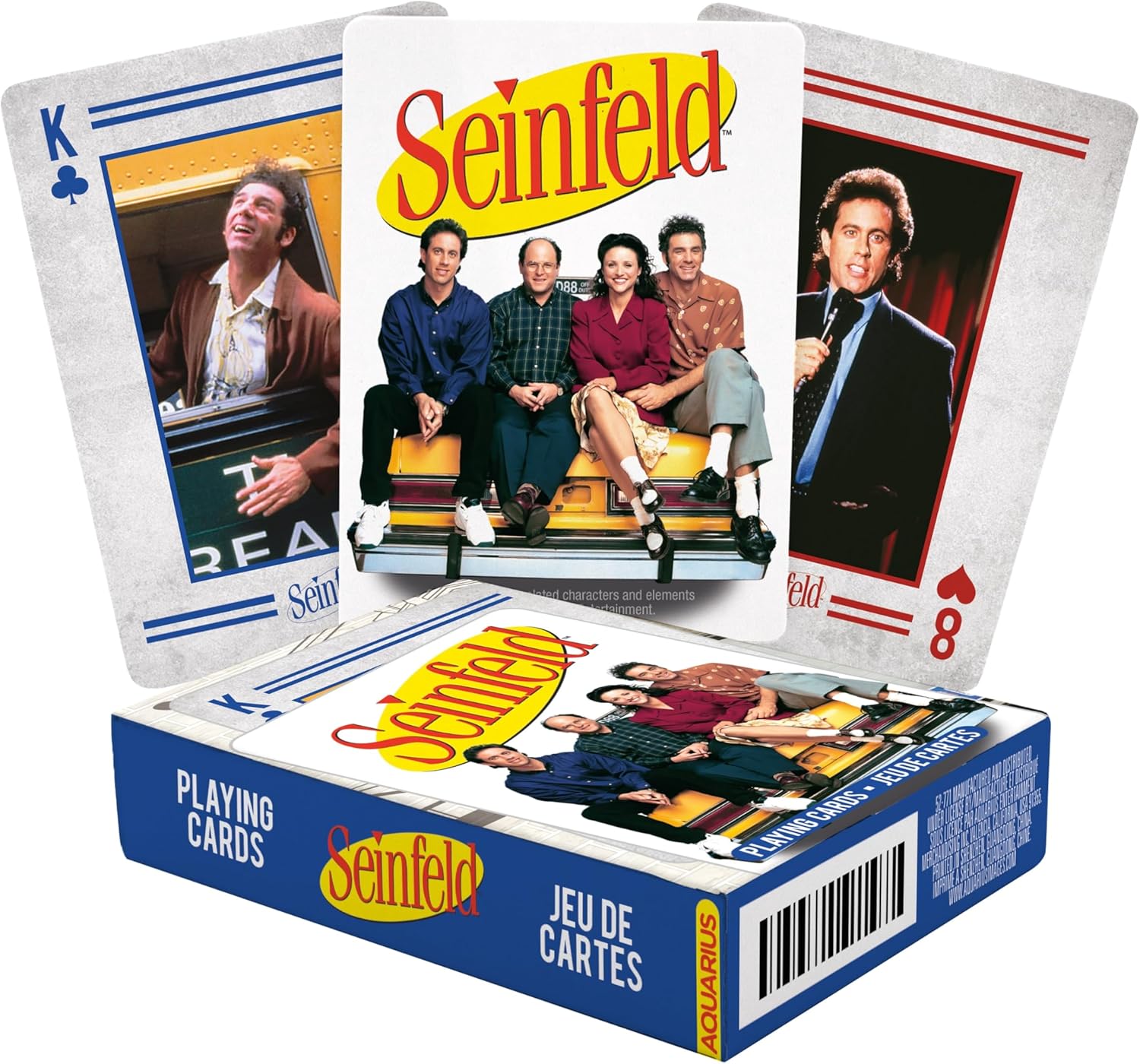אין סיבה לשחק קלפים רגילים כשאפשר לשחק עם ג'רי, איליין, קריימר וג'ורג' על כל קלף. בחבילה הזו תמצאו 52 קלפים ועוד 2 ג'וקרים, כולם מעוצבים עם רגעים ודמויות אייקוניות מהסדרה.