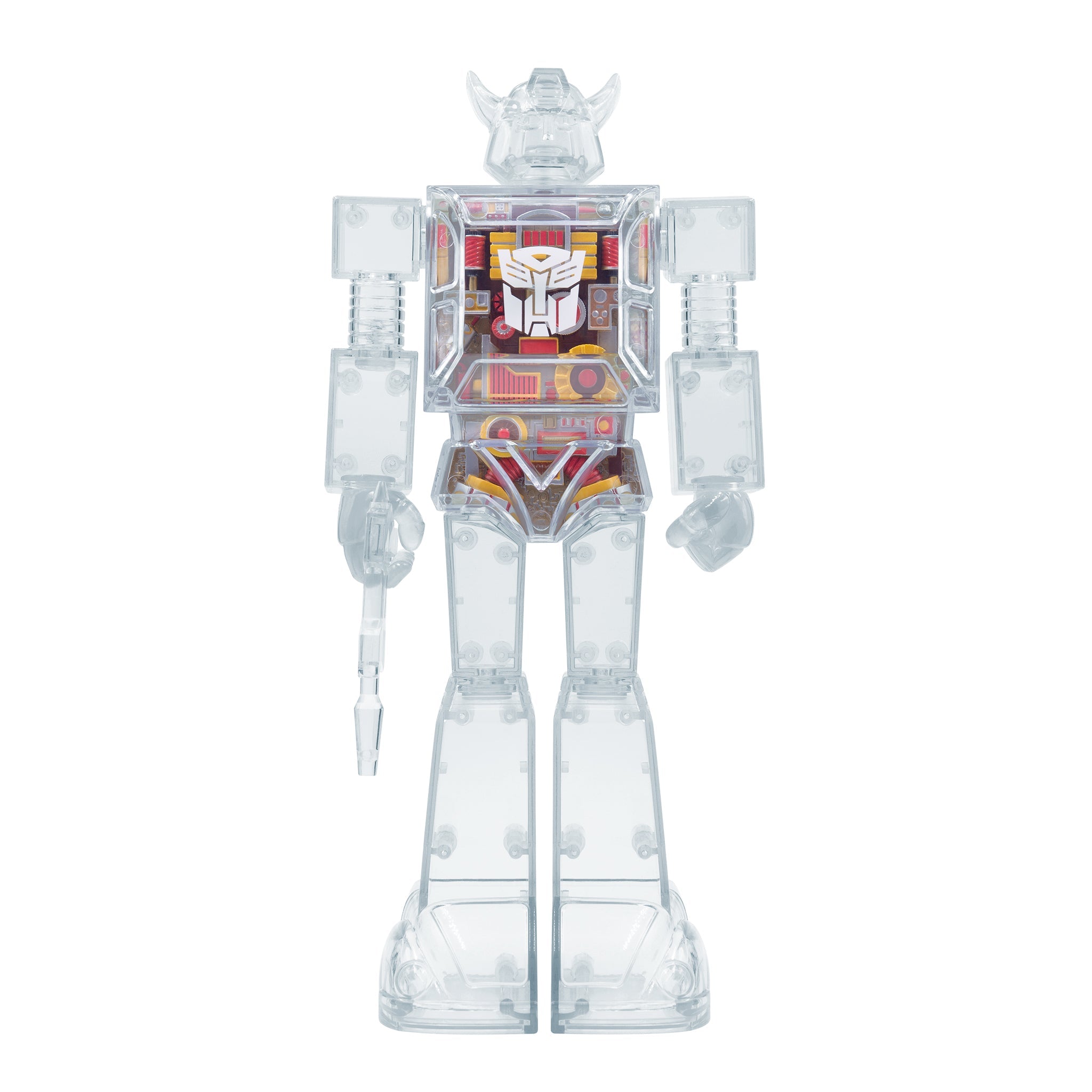 With its clear plastic shell and blaster accessory, itโs easier than ever to see why youโd want to add the Super Cyborg Clear Bumblebee figure to your Transformers collection!