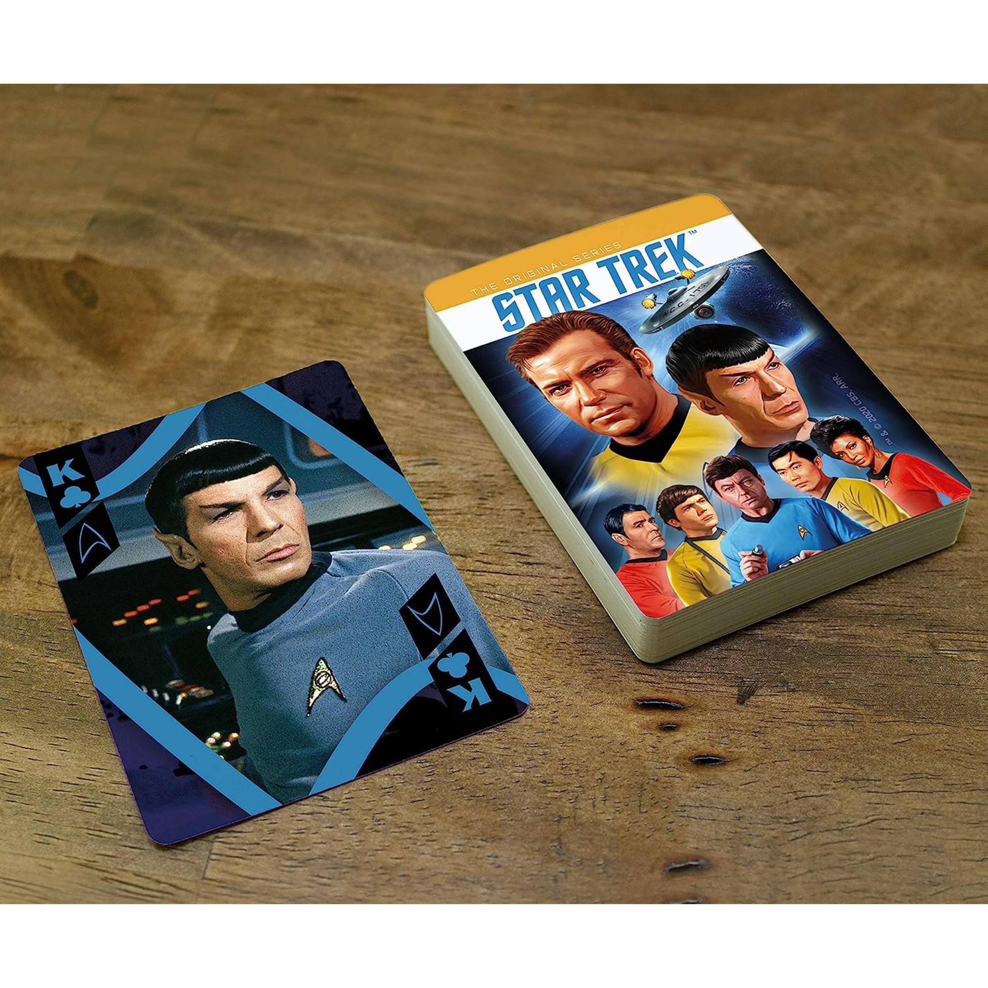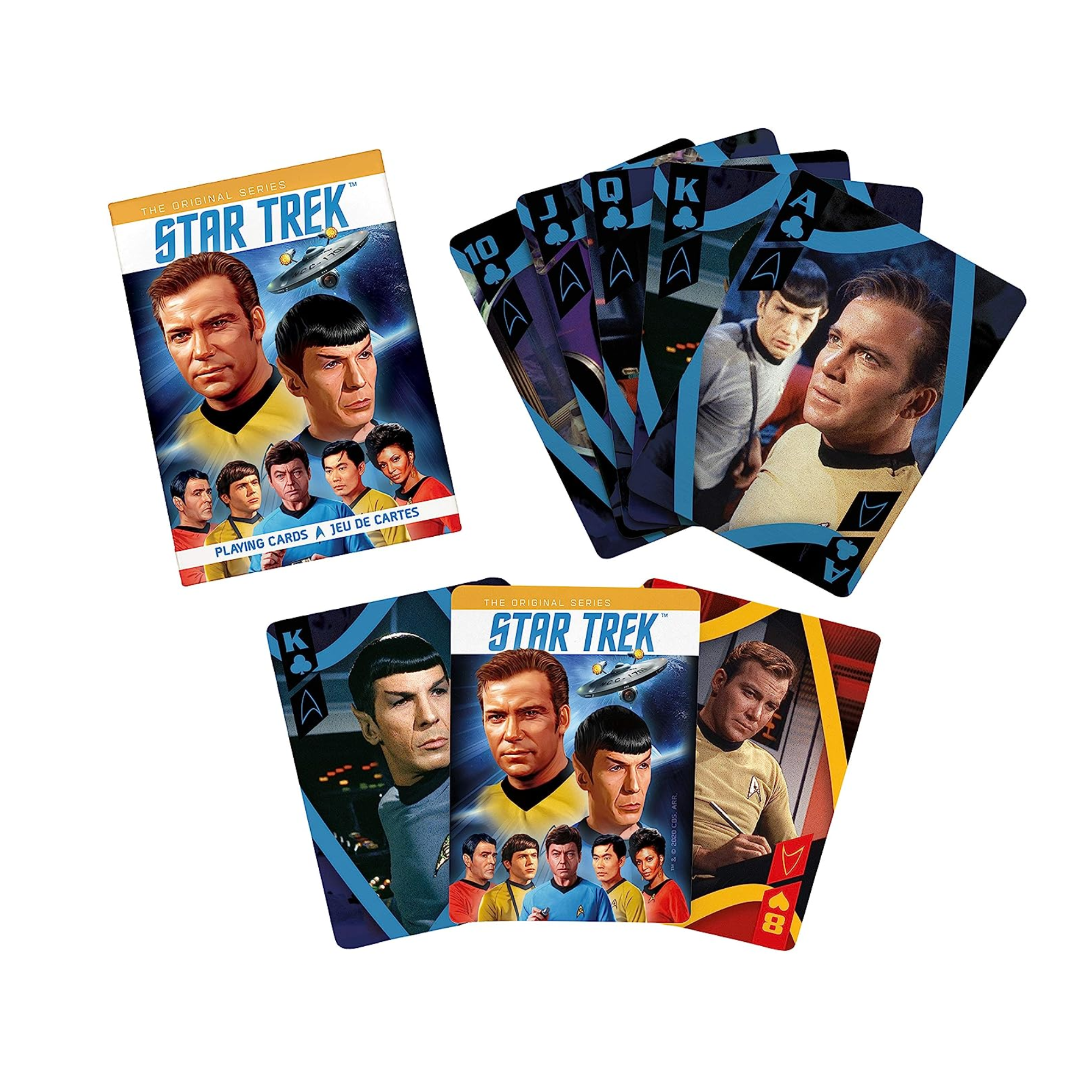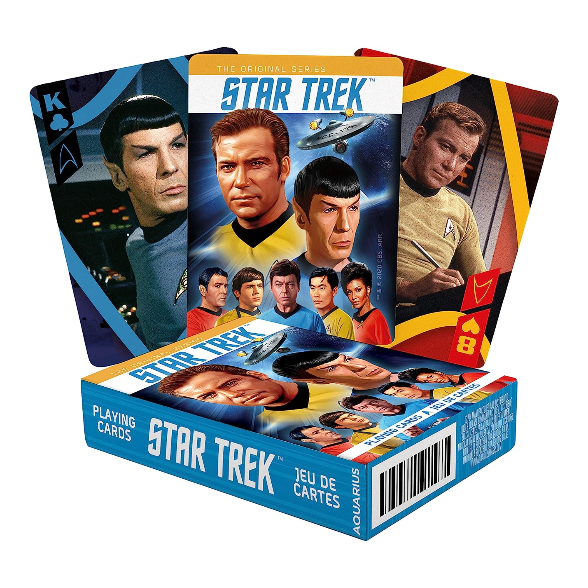 חפיסת קלפים באווירה חללית, עם מגוון דמויות מסדרת הטלוויזיה המקורית של מסע בין כוכבים.