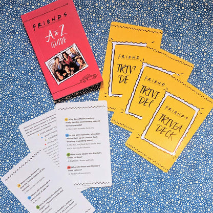 המשחק הזה יאפשר לכם לאסוף את החברים האהובים עליכם (אבל בלי להתערב על הדירה!) לסיבוב בזק של טריוויה. הוא כולל 50 קלפים עם 200 שאלות שיבדקו את הידע שלכם על כל הפרטים הכי קטנים, והסט כולו מבוסס על משחק הטריוויה שרוס גלר המציא באותו פרק מיתולוגי, אז תתכוננו! וכדי שלא תיתקעו בלי תשובה, אל תשכחו לרענן את הידע שלכם עם מדריך A עד Z של "חברים" שמגיע יחד עם הקלפים
