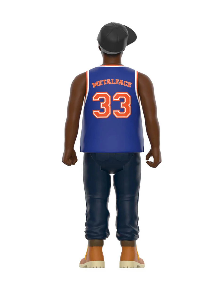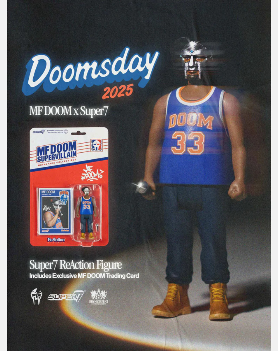 דמות ריאקשן של אגדת היפהופ MF DOOM זצ"ל בלבוש של שחקן כדורסל ניו-יורקי, עם המסכה האייקונית שמזוהה איתו, מיקרופון, וגם קלף אספנות בסגנון NBA.