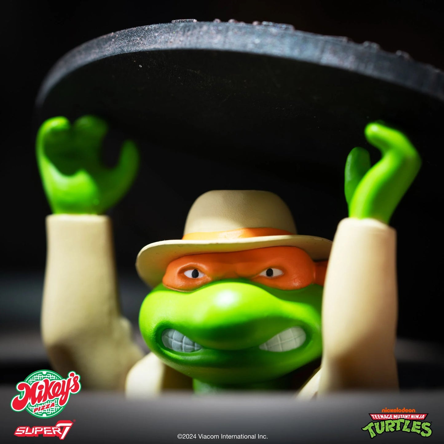 לא צריך להיות בלש דגול כדי להבין שמיכלאנג'לו במסווה הולך לחשוף את כל המזימות המרושעות של שרדר וכנופיית הפוט!דמות ReAction של מיכלאנג'לו במסווה, בגודל 9.5 ס"מ, מגיעה בהשראת סדרת האנימציה הקלאסית, ארוזה בצורת פרוסת פיצה וכוללת זוג נונצ'קות